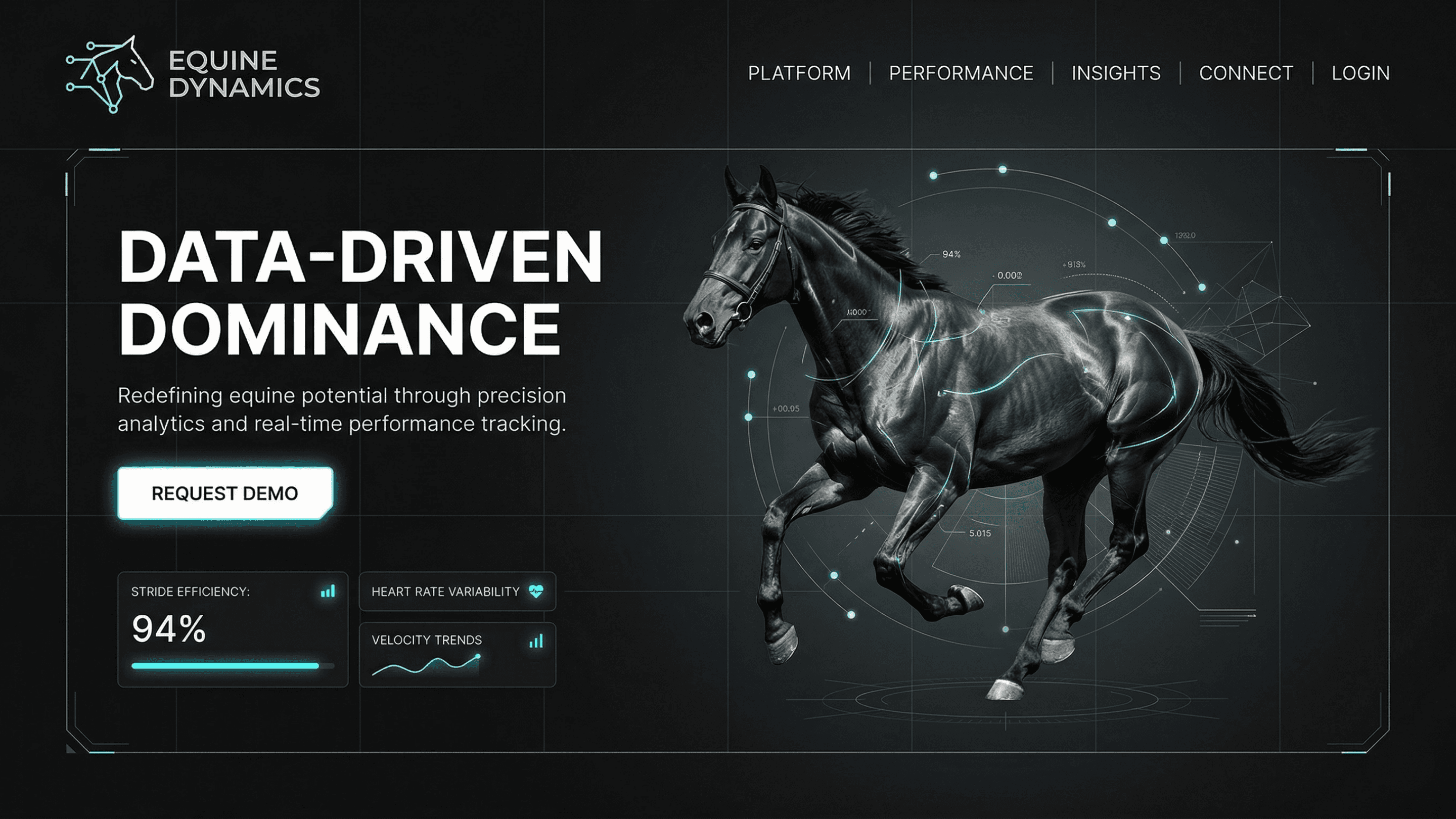 A futuristic platform concept that positions horse racing through the lens of data, performance analytics, and precision tracking. Strategic Intent: A dark, minimal interface layered with glowing data visualizations creates a sense of intelligence and control. The horse becomes a living dataset, visually augmented with performance metrics.